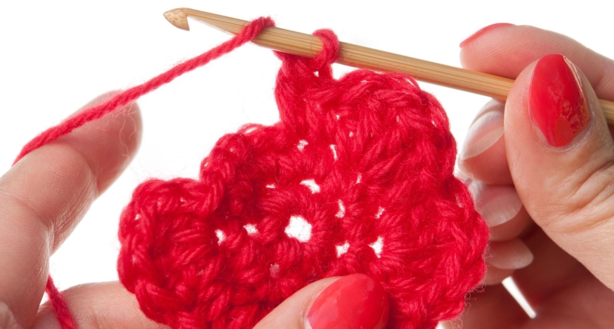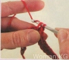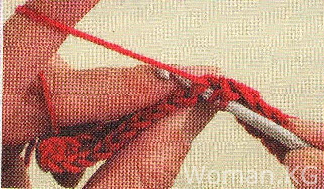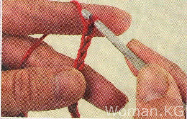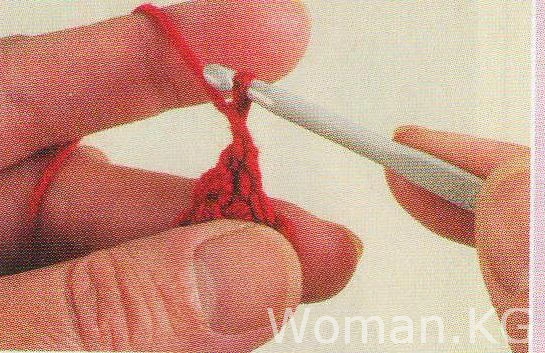 Сделайте скользящий узел приблизительно в 15 см от конца нити красной пряжи и проденьте в него крючок. Свяжите 24 пц.
