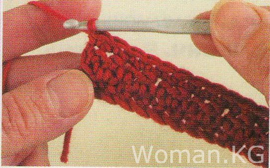 2-й рд: I вп, I сбн в I -й п., * 1 сбн в каждой п. до конца ряда, перевернуть (не делая вп).