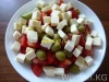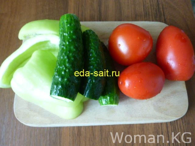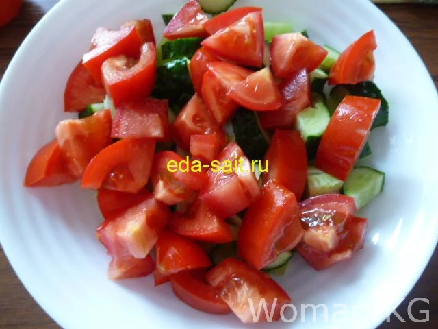 Шаг 4. Следом за перцами и огурцами в салатник отправились свежие помидоры. Все овощи я нарезала не мелко, а средними ломтиками.