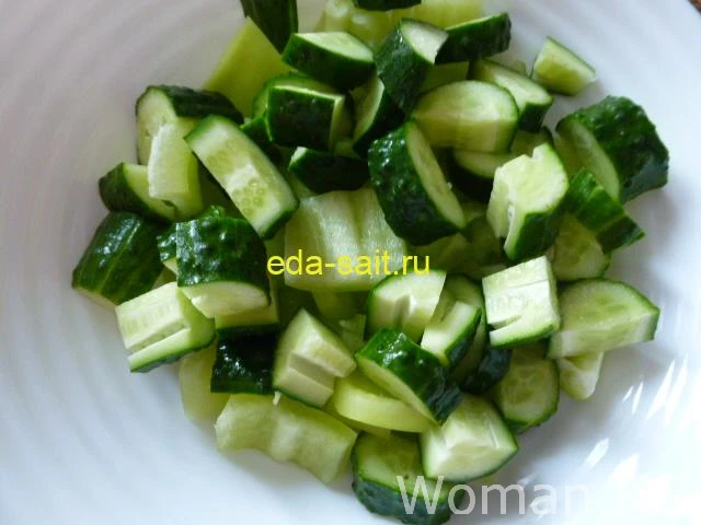 Шаг 3. Затем нарезала свежие огурцы и выложила его к болгарскому перцу.