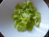 Шаг 2. Овощи подготовила и сразу же приступила к нарезке и формированию греческого салата с адыгейским сыром. Первым я нарезала болгарский перец и выложила его в салатник.